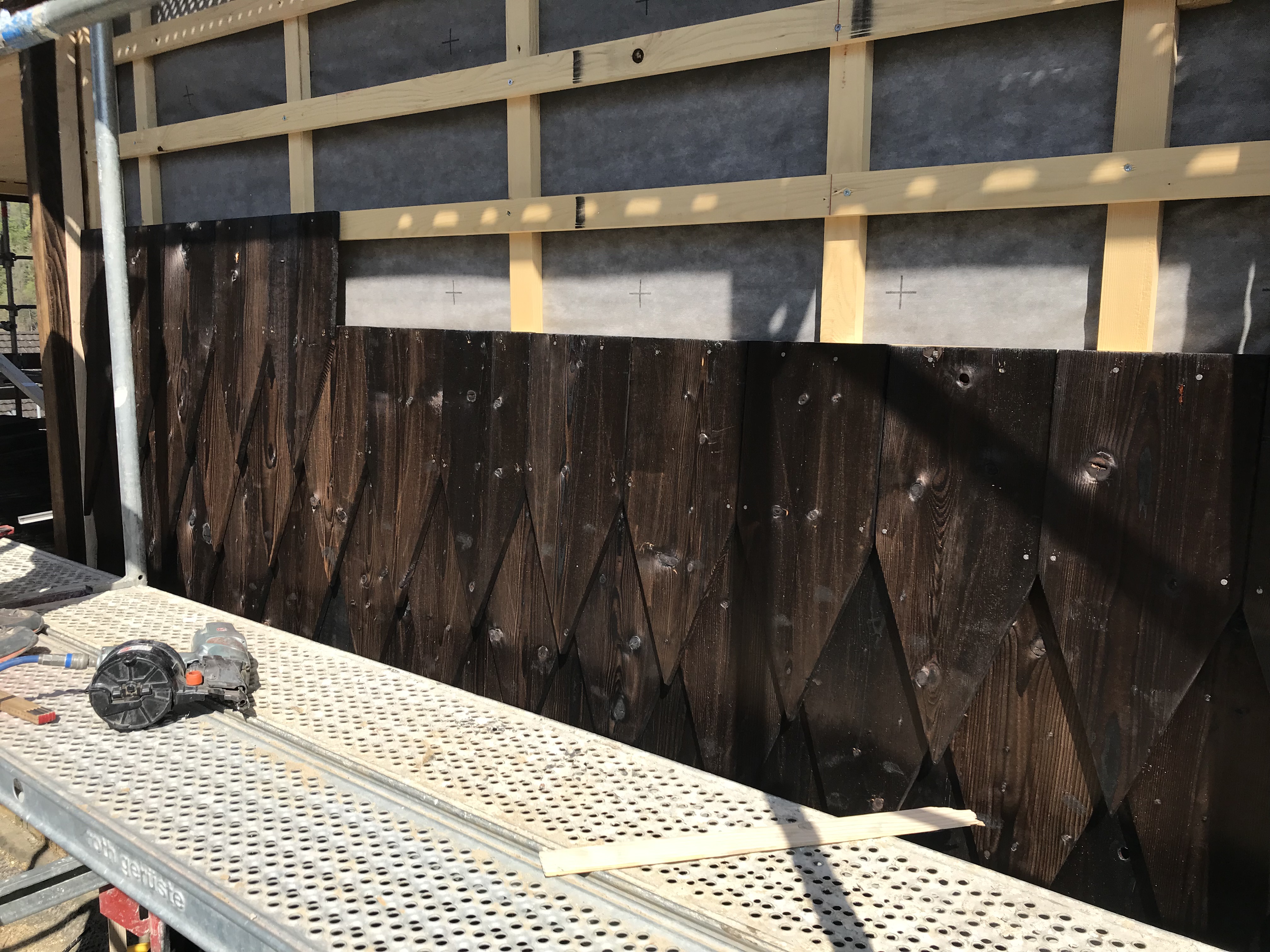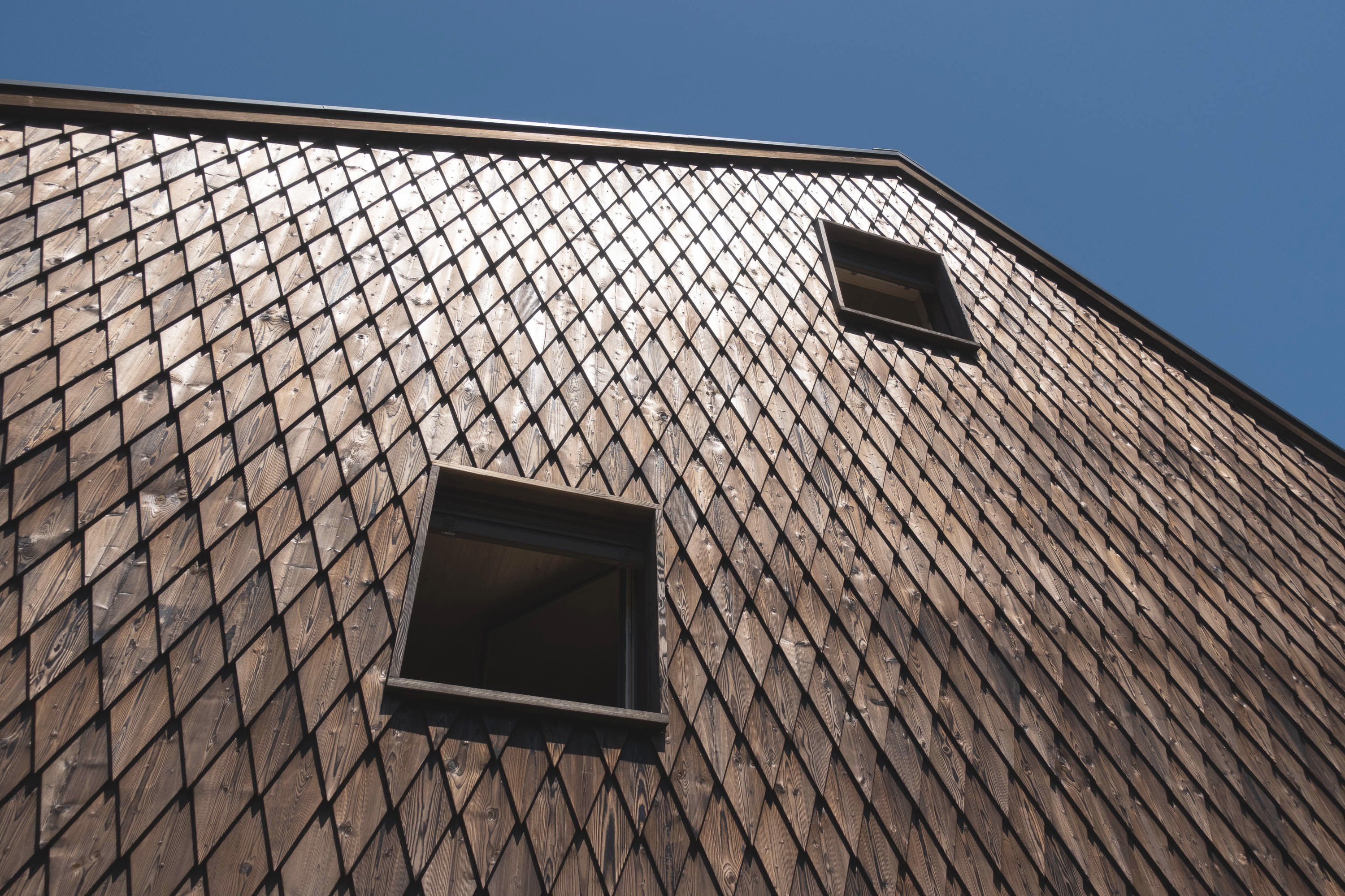 Die Rhombusform der Schindeln erzeugt eine textile, fast hautartige Oberfläche. Die Fassadenschicht wirkt wie eine schützende Hülle – sie strukturiert das Volumen, reagiert auf Licht und unterstützt die Ableitung von Wasser.