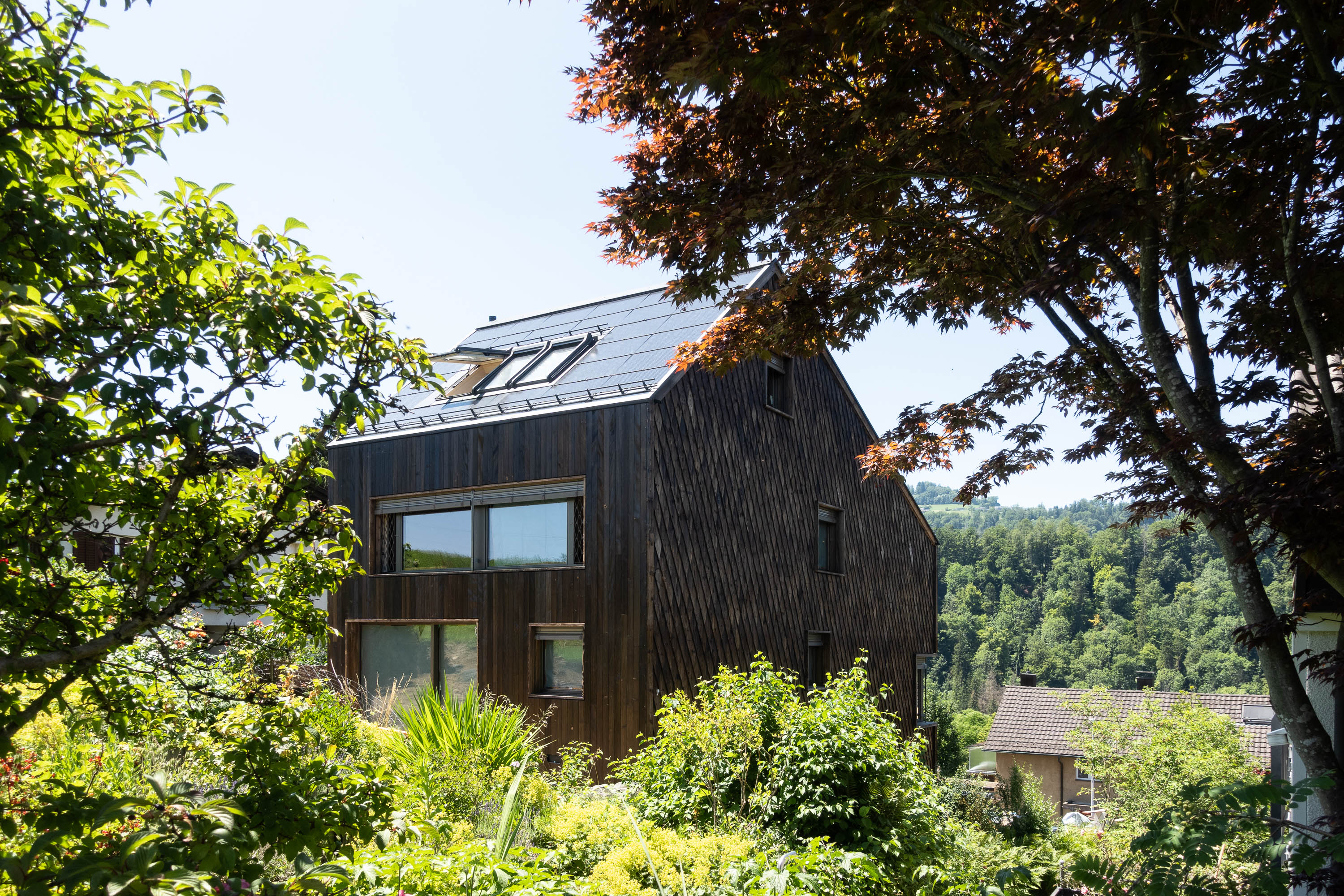 Für das Einfamilienhaus in Gattikon wurde die Gebäudehülle in Holzschindeln ausgeführt.